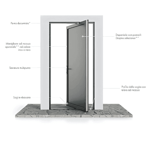 Caratterizzata da un pannello decorativo elegante e una maniglia da incasso opzionale disponibile in finitura inox o nera, offre una versatilità estetica perfetta per ambienti contemporanei. Il sistema di serratura multipunto assicura una protezione superiore, mentre il profilo della soglia con telaio ad incasso aggiunge un dettaglio raffinato e garantisce stabilità e isolamento. Questa porta è disponibile con pannelli “Design Personalizzabili” per adattarsi a qualsiasi stile, mantenendo un look essenziale e sofisticato.